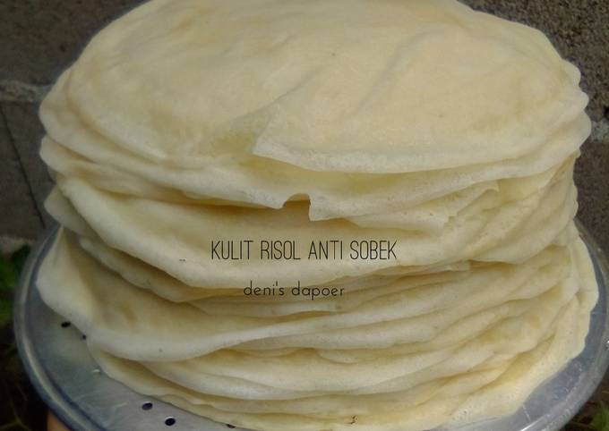 Nugraha dari The Jayakarta Bandung berikut. Pada resep ini kulit risol atau kulit risoles teksturnya lentur, mulus, tidak berlubang, lembut dan empuk tidak gampang robek dan tidak gampang pecah kalau sudah diberi bahan isian dan digoreng akan garing renyah dan crispy tapi tetap empuk dan lembut di dalam. Lihat juga cara membuat Kulit risol tanpa telor dan anti robek dan masakan sehari-hari lainnya.