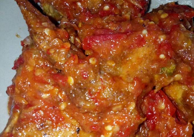 Balurkan daging ayam dengan campuran garam, ketumbar, dan bawang putih. Masak di atas minyak goreng panas hingga kecokelatan. Selanjutnya, siapkan sambalnya dengan cara mencampurkan semua bahan sambal. Letakkan ayam goreng di cobek, tambahkan sambal.